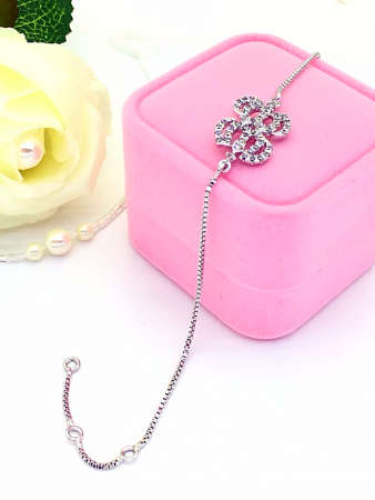 Тонкий серебристый браслет длиной 20 см с тремя застежками разной длины. В центре стилизованный цветочный орнамент с белыми фианитами длиной 16 мм. Браслет подчеркнет изящество вашего образа.