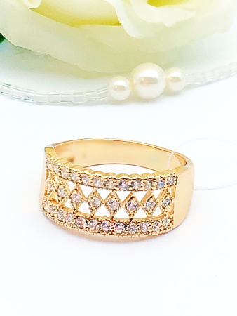 Роскошное золотистое кольцо шириной 9 мм, основным украшением которого является поистине королевский узор, усеянный фианитами.