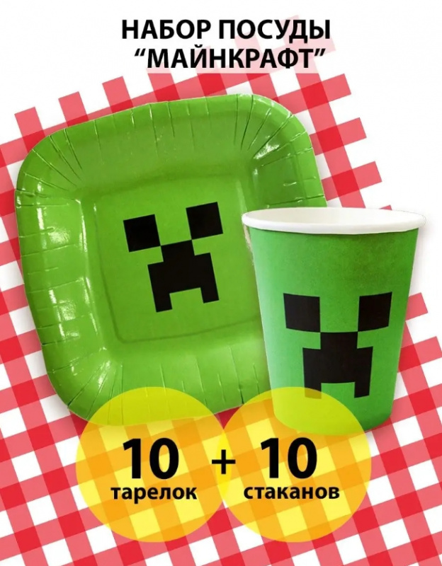 Майнкрафт (Minecraft) Набор посуды (10 стаканов + 10 тарелок)