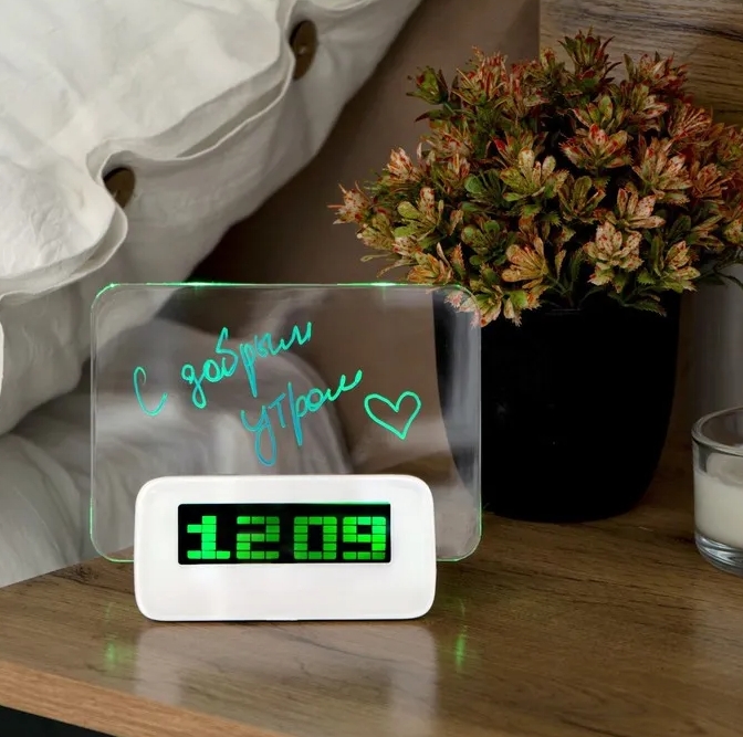 Стильные многофункциональные часы с прозрачной доской для записей. Для романтиков – отличная возможность всегда написать новое пожелание для любимого человека, для практиков – удачно место для напоминаний о важных событиях, встречах и рабочих дедлайнах.